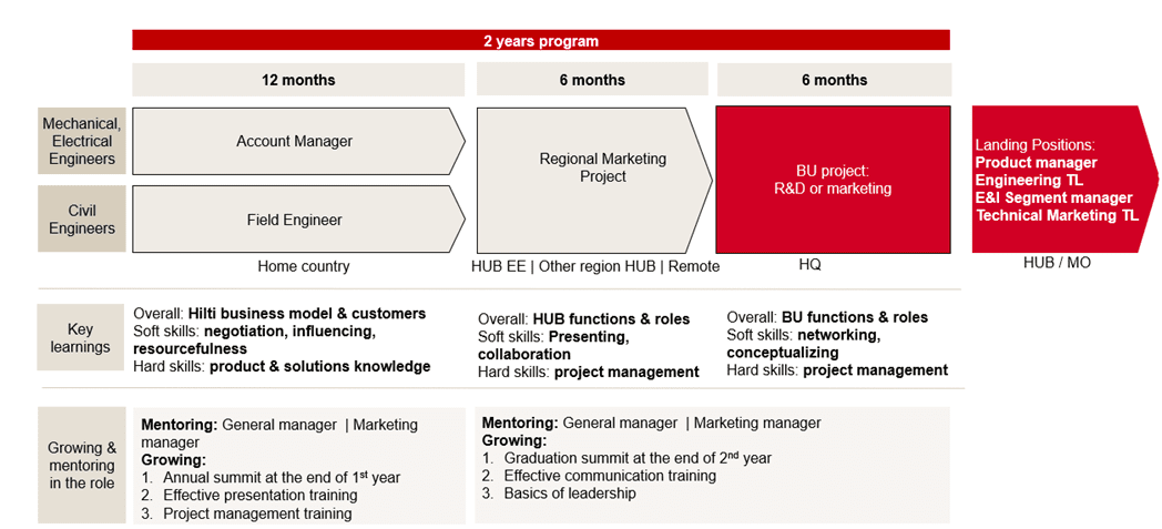 Hilti Engineering Leadership Development Program is two-year program, where you’ll step out from narrow expert career and will be involved in exciting projects, with lots of exposure to senior management